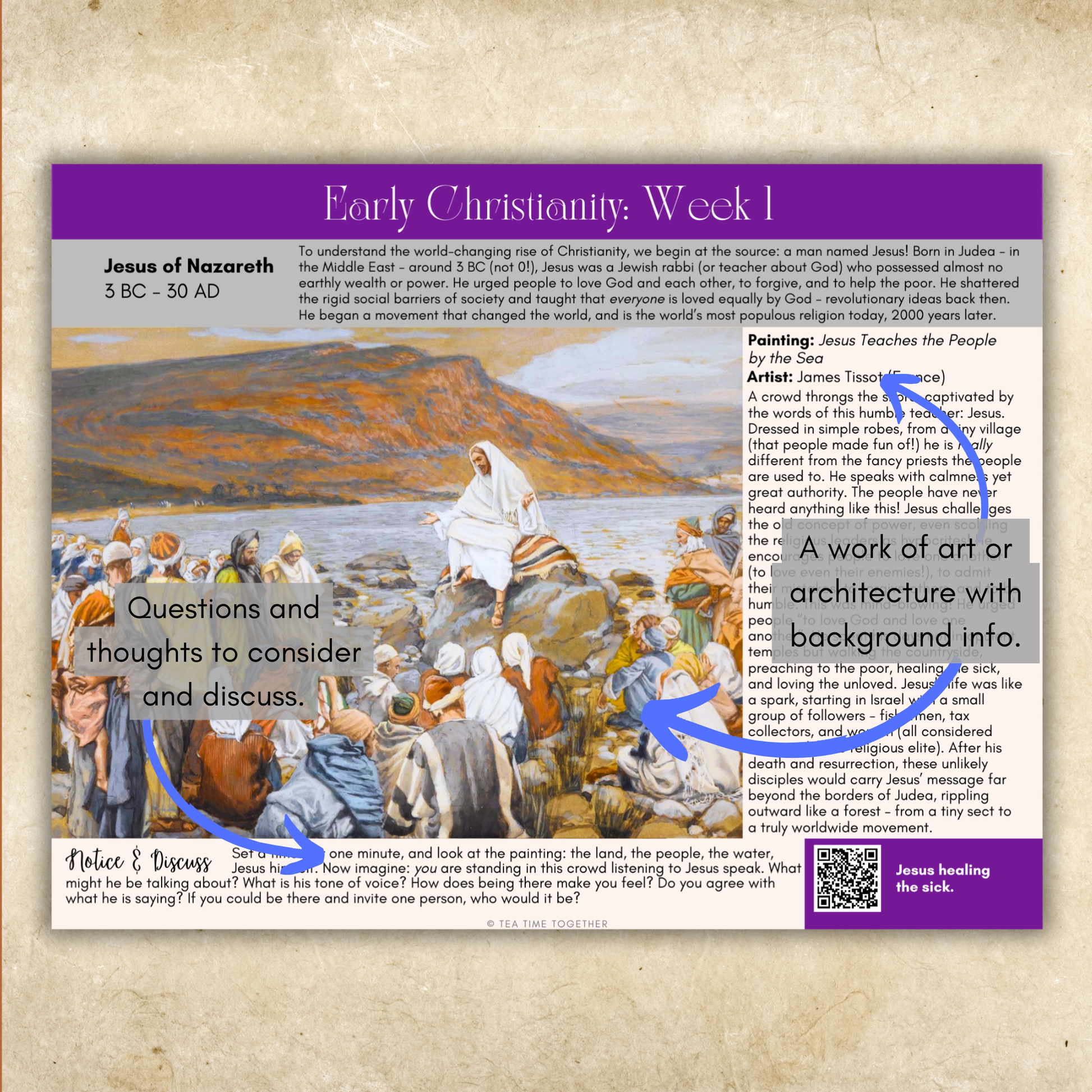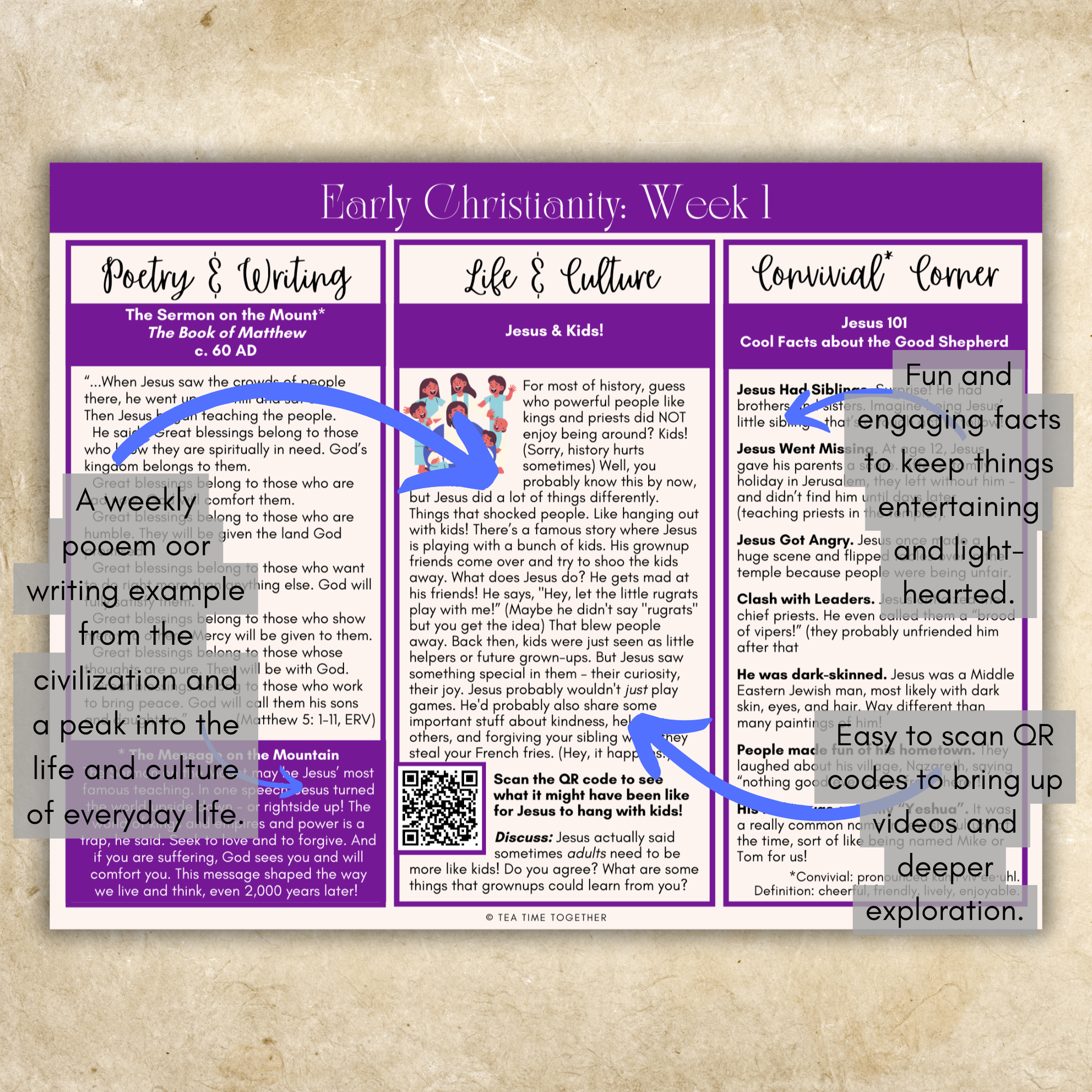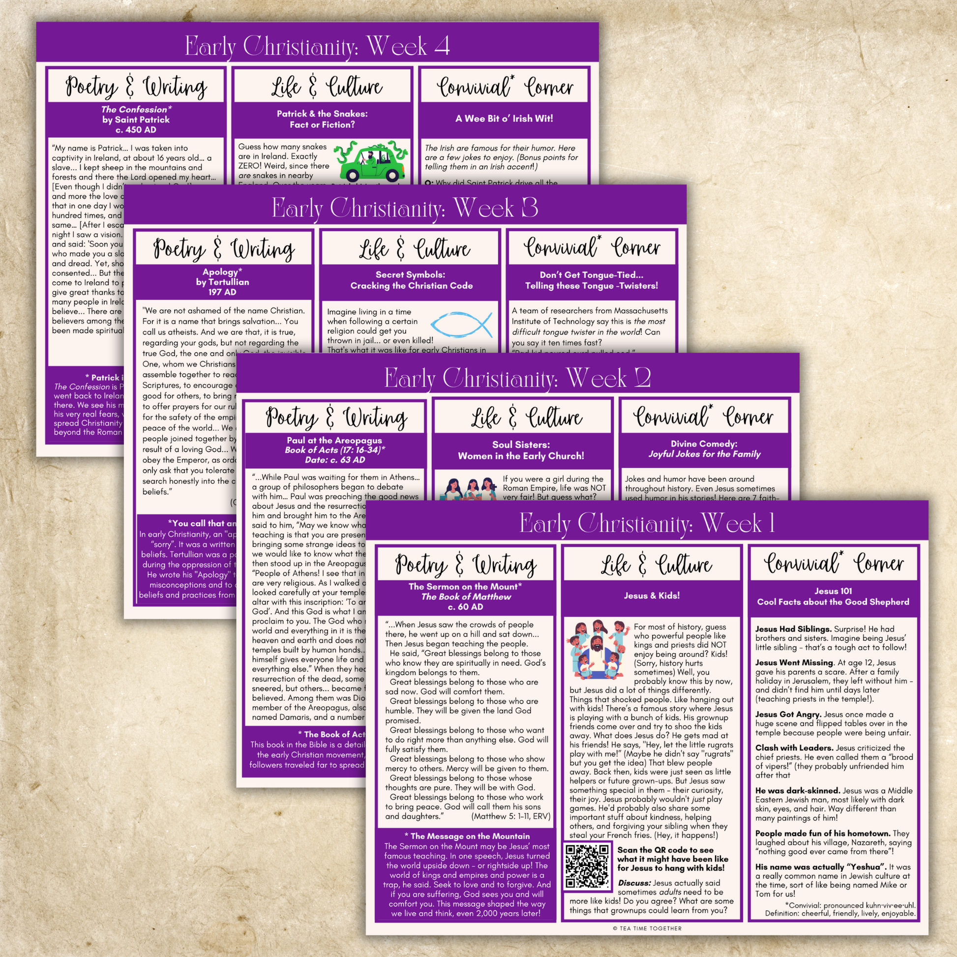 -4 Lessons (designed to be done once a week): This is the core of the curriculum! Weekly lessons cover the following: The Life of Jesus, The Apolstolic Age, Rome Vs. Christianity & Patrick of Ireland. Each week includes a piece of art, a poem or writing excerpt and a music or cultural spotlight. Plus, we include a bonus section purely for fun - which keeps kids engaged and active. These guides include everything you need, making it easy to integrate into your homeschool schedule.