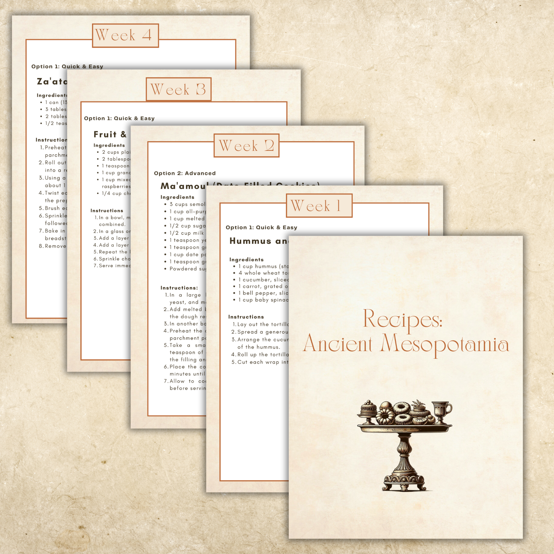 - Recipes (optional): You may supplement your lessons with a fun recipe each week. We’ve curated easy and delicious recipes inspired by the very civilization you will study each week!