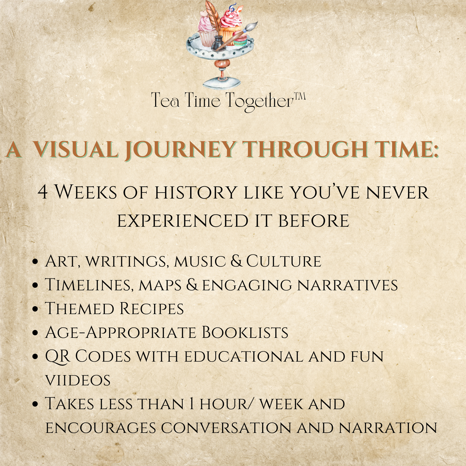 Welcome to Tea Time Together™ History: Ancient Civilizations, a revolutionary new homeschool curriculum designed to make learning history an engaging and enriching experience for the whole family. Say goodbye to rote memorization of dates and names and hello to a vibrant exploration of art, literature, and culture. Served over tea and snacks, this curriculum encourages meaningful conversations and connections among family members.