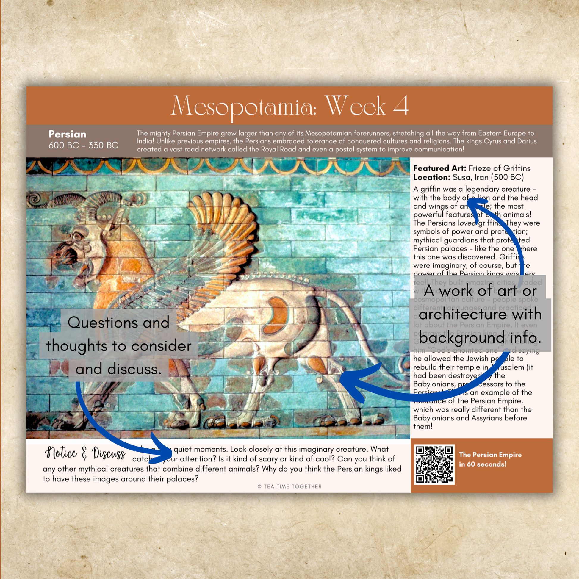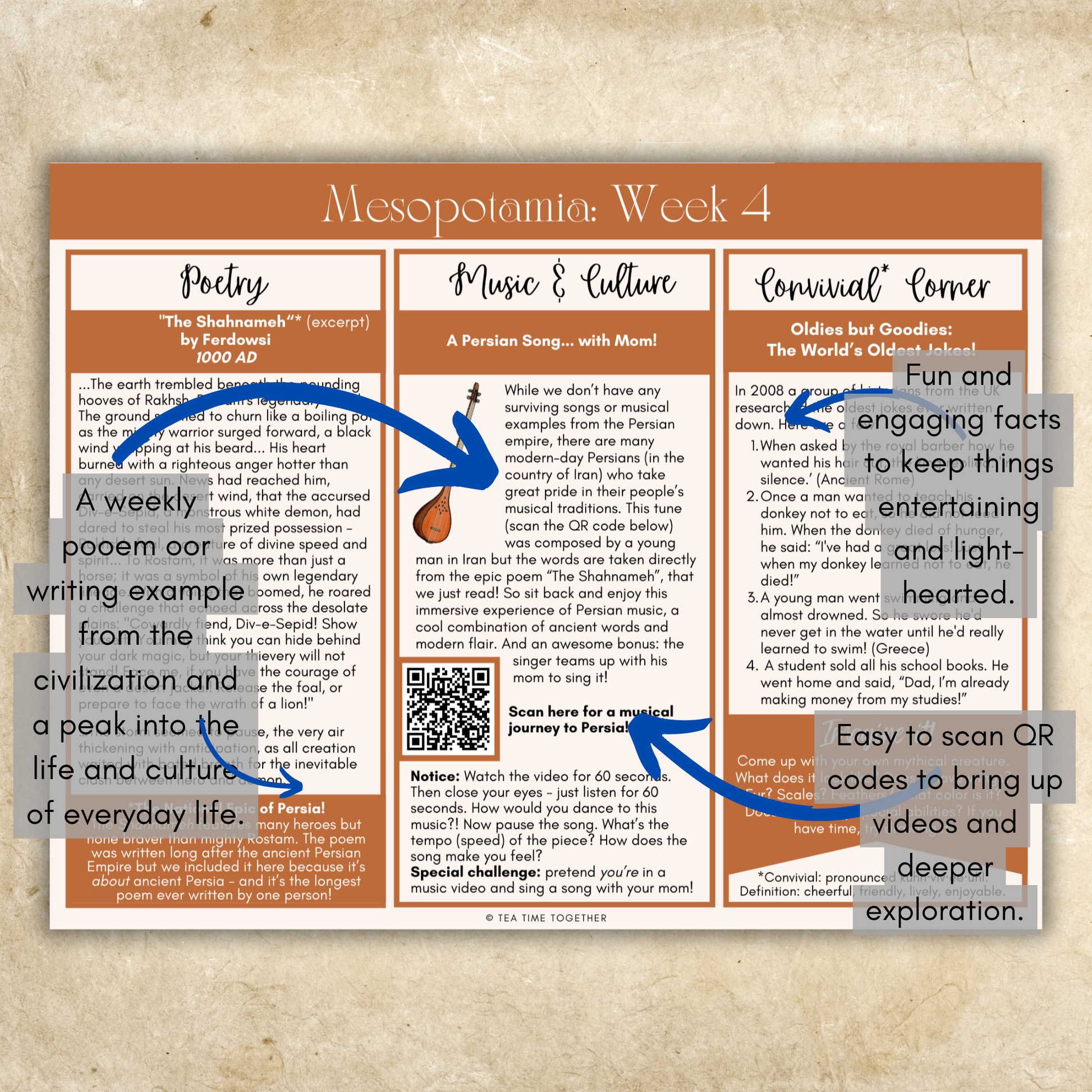 -4 Lessons (designed to be done once a week): This is the core of the curriculum! It includes Sumer, Assyria, Babylon & Persia. Each week includes a piece of art, a poem or writing excerpt and a music or cultural spotlight. Plus, we include a bonus section purely for fun - which keeps kids engaged and active. These guides include everything you need, making it easy to integrate into your homeschool schedule.