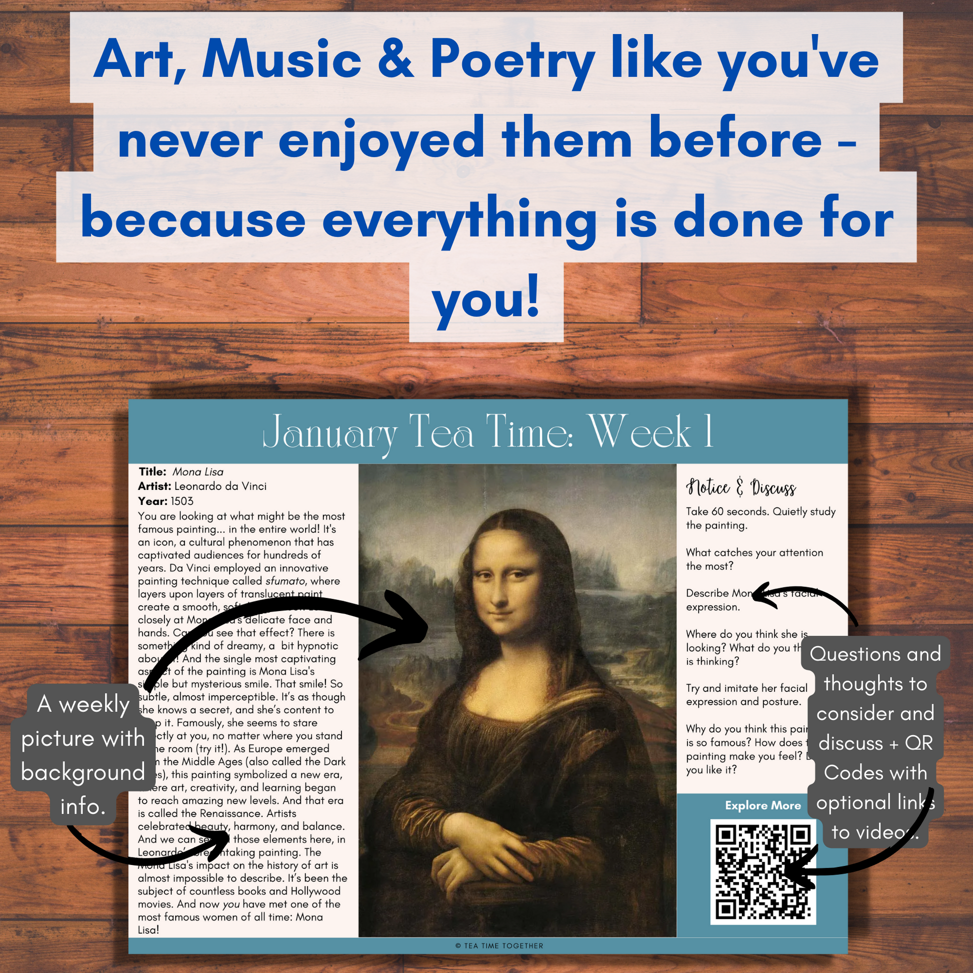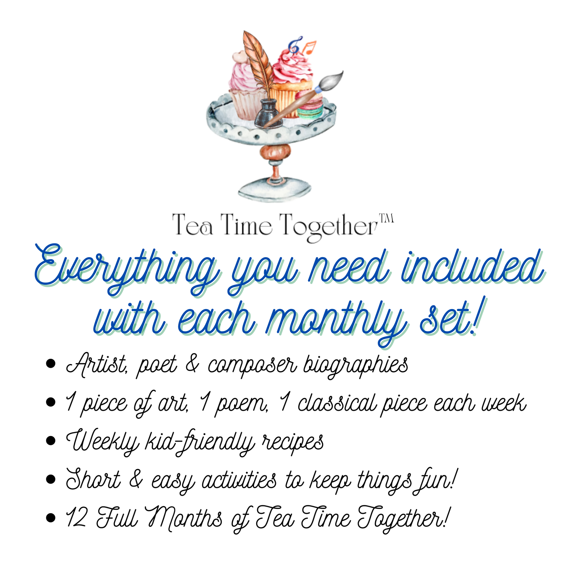 everything you need to do art, music, and poetry appreciation over a cup of tea and a treat It's a delightful way to bond and create lasting memories with your family.