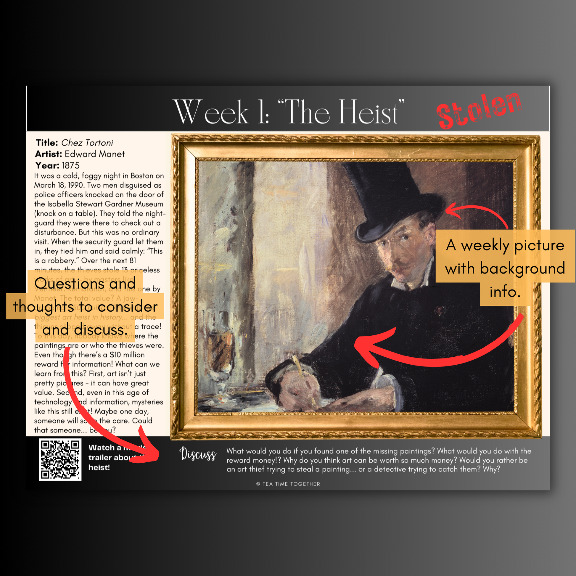 Perfect for sparking rich conversations and curiosity, these engaging, fun-filled guides transform your tea time into a thrilling adventure through art’s most mysterious events.