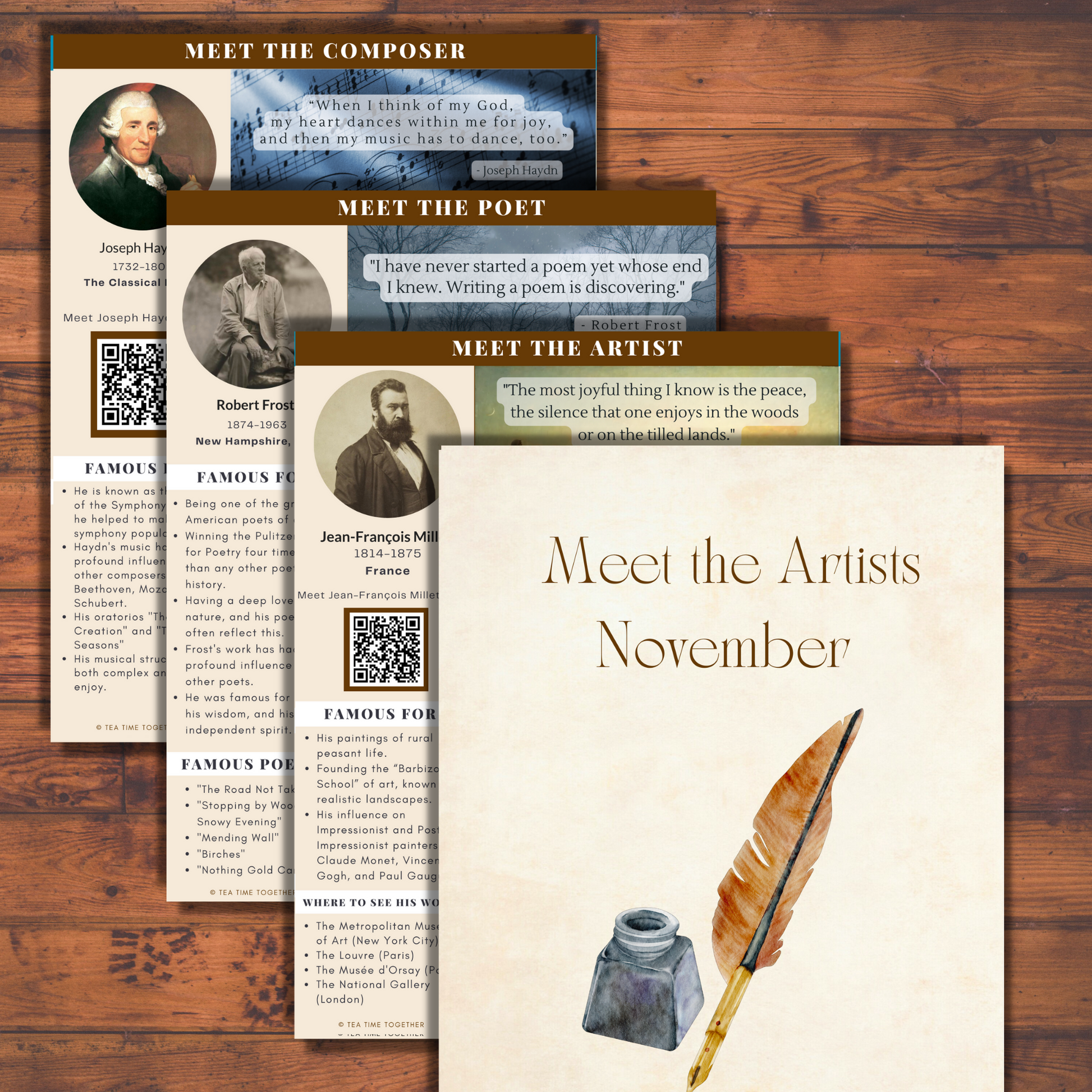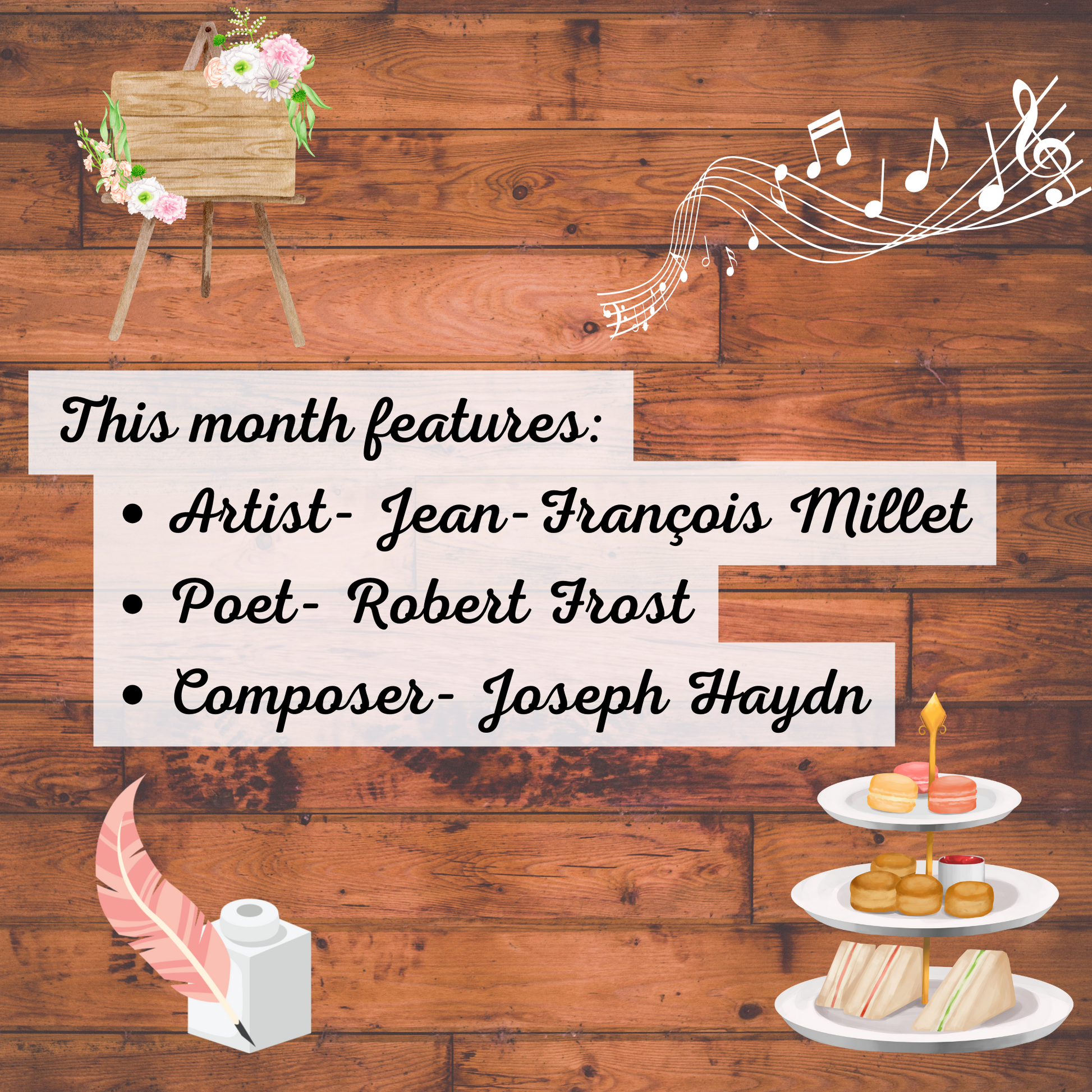 Over the month, you'll explore four paintings from the same artist; four poems from the same poet; and four songs from the same composer. By the end of the month, you and your students will feel like you know these artists and their works!