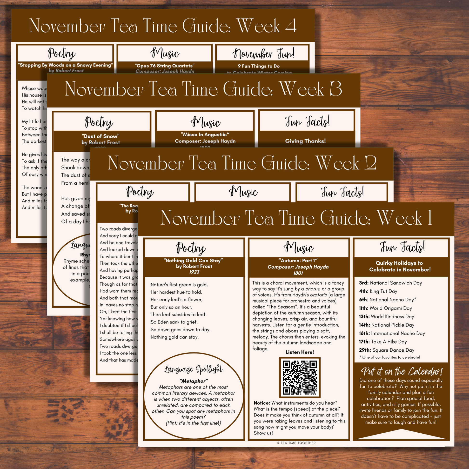 - ‘Tea Time Guides’: 4 Weekly Guides to be printed 2-sided. (8 pages)