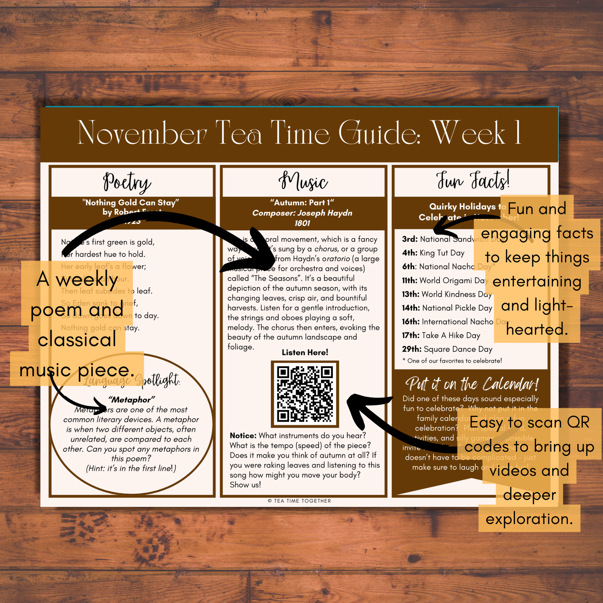 There has never been a more delightful way to study fine art, classical music and poetry! Tea Time Together™ includes everything you need to do art, music, and poetry appreciation over a cup of tea and treats.