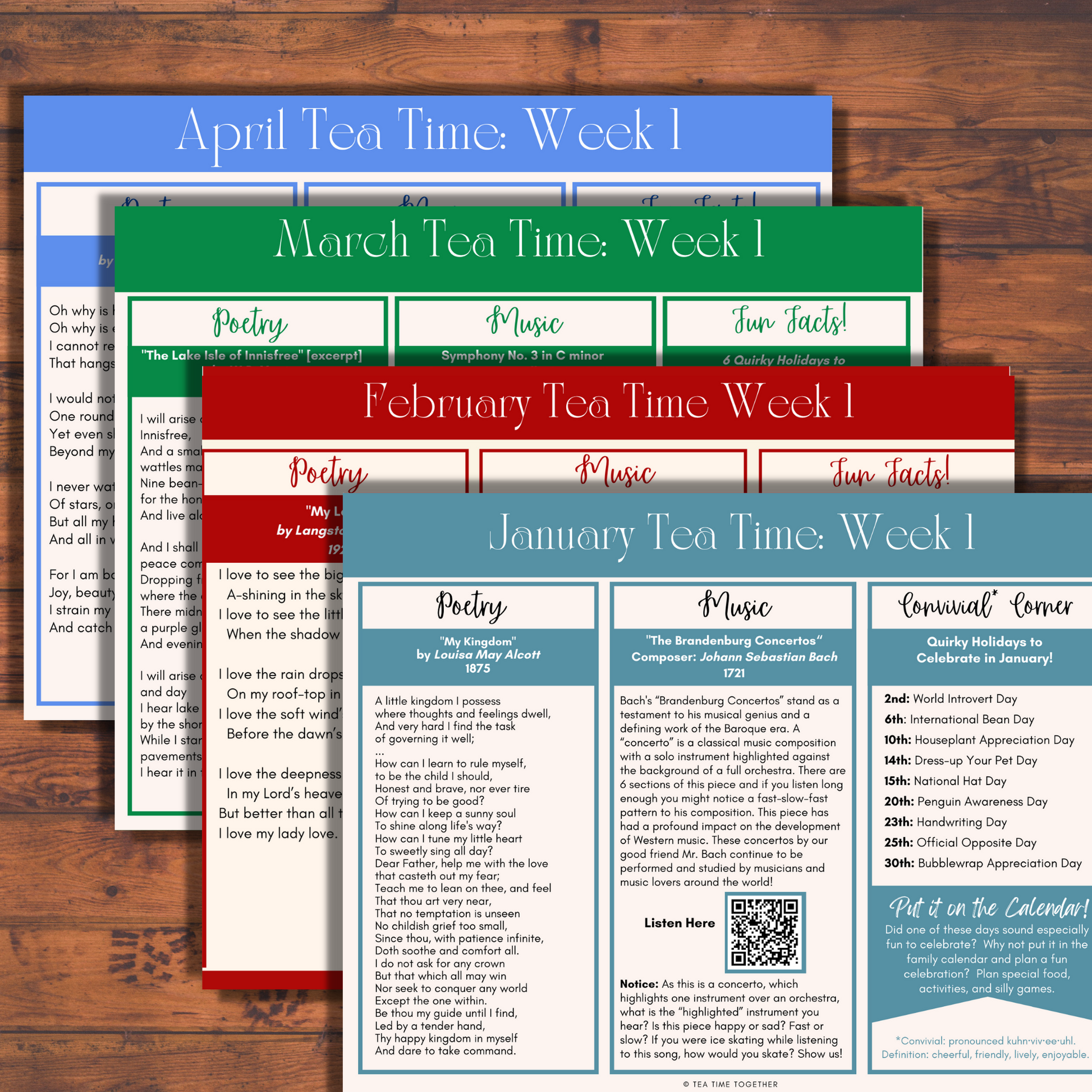 Our Tea Time Together guides come with everything you need to do art, music, and poetry appreciation over a cup of tea and a treat It's a delightful way to bond and create lasting memories with your family.